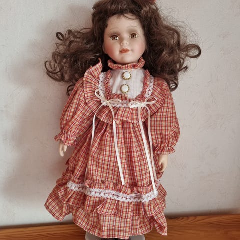 Seisova 42 cm korkea posliini nukke.
