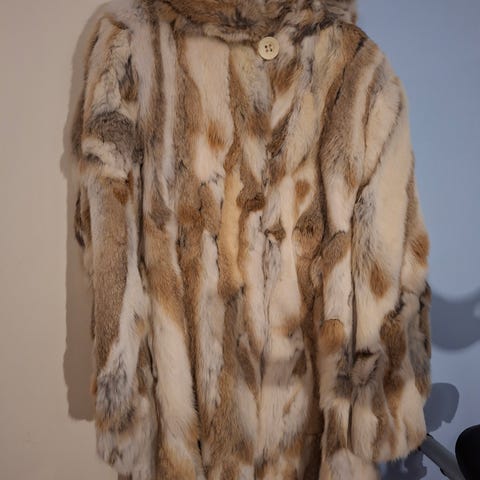 Tummansininen kaniturkki. Koko noin 46-48 a pituus 135cm. Muutama kiinnityshaka puuttuu a vaatii kunnostusta.