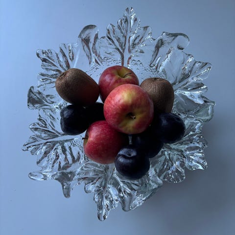 Humppilan lasin Kasvimaalla-kulho (en ole aivan varma nimestä). Kokrkeus 10 cm ja halkaisija 25 cm. Täysin ehjä ja virheetön.