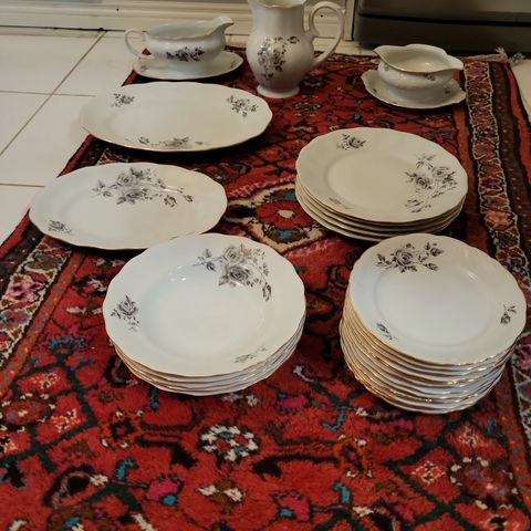 Ihastuttava Walbrzych vintage astiasto (Puola). 4 kuppia, 6 tassia, kahvipannu, sokerikko, kermakko. Kermakossa pieni särö (kuva), muuten todella hyvässä kunnossa. Kulkeutuu Helsinkiin omien menojen mukaan. Postitan ja pakkaan hyvin.