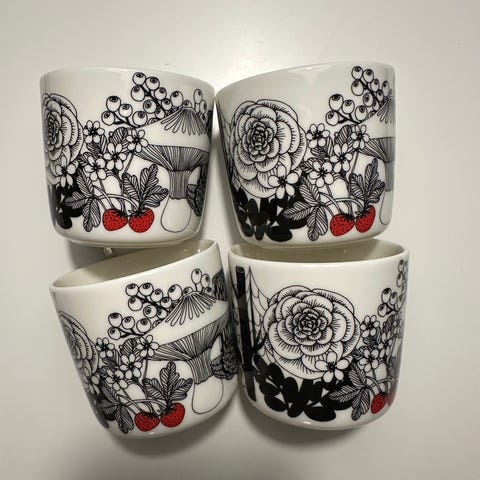 Kolme keraamista kuppia, joiden vetoisuus noin 2dl, korkeus noin 7cm ja halkaisija noin 7,5cm. Marimekko, design Carina Seth Andersson (kuosi) ja Sami Ruotsalainen (astia).