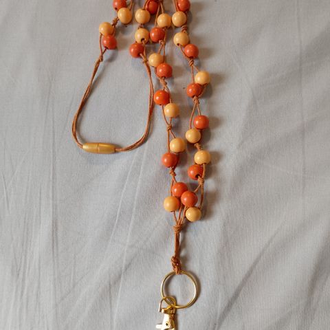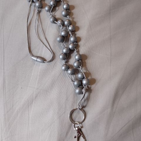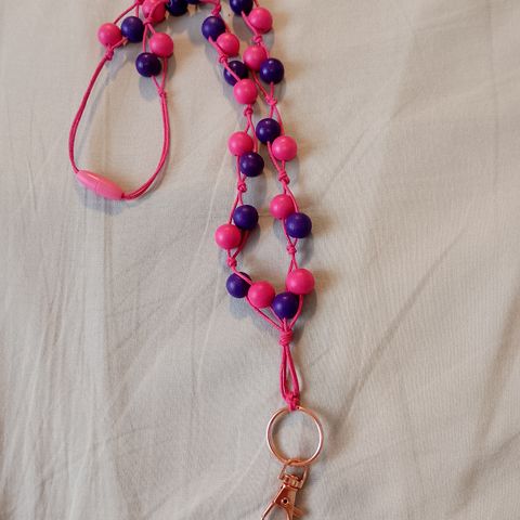 Vahva, mutta taipuisa teräsvaijeri. Vaaleanpunaiset helmiäislasihelmet 8 mm ja 6 mm, siemenhelmet. Tuplarengas 25 mm ja metallihelmet ruostumatonta terästä. Muut metalliosat nikkelittömiä ja lyijyttömiä.