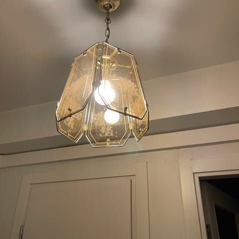 Valaisin (riippuvalaisin puu- ja metalliosilla valkoisilla lasivarjostimilla)