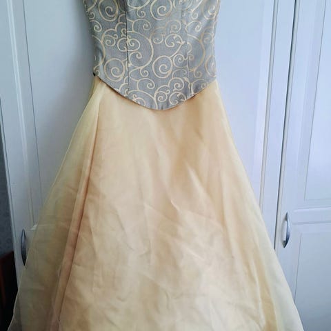 Myydään kuvan siisti upea juhlapuku. Koko reilu S. Kuvat keinovalossa ja ilman.