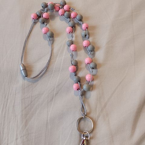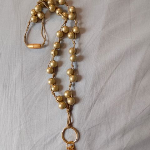 Vahva, mutta taipuisa teräsvaijeri. Vaaleansiniset helmiäislasihelmet 8 mm ja 6 mm, siemenhelmet. Tuplarengas 25 mm ja metallihelmet ruostumatonta terästä. Muut metalliosat nikkelittömiä ja lyijyttömiä. Pituus suorana avainlukon loppuun n. 50 cm. Ovh. 29,00 €.