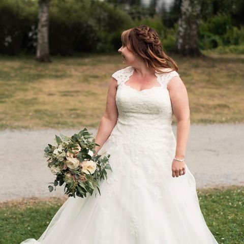 Kokonaan pitsiä oleva hääpuku laahuksella. Koko 40 hitusen kavennettu kainaloista. Muutamasta napista puuttuu kangas. Ihana päällä ja kevyt. Ovh 1380e