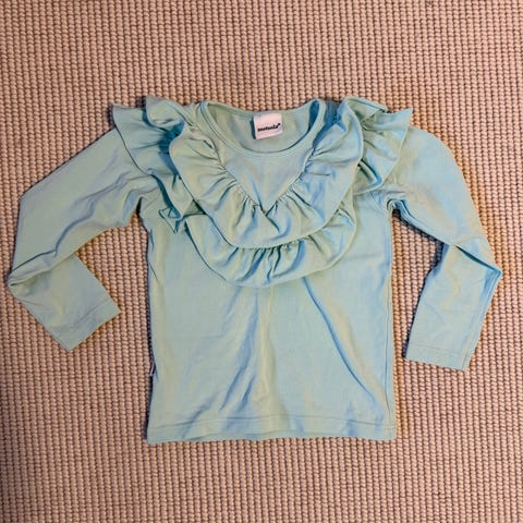 Oikein hyvässä kunnossa oleva Metsolan frillapaita. Väri edelleen vahva musta, eikä tahroja tai muita moitteita. Koko 98, mutta mielestäni pientä kokoa.