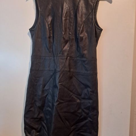 Hihaton, rento mekko. Alareunassa econahkaa. Sivusaumoissa taskut. Mekossa on vuori. Ei vartalonmyötäinen. Takana pitkä vetoketju.