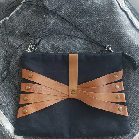 Tumman harmaa kangas jossa edessä nahkainen koriste ja olkahihna myös nahkaa.