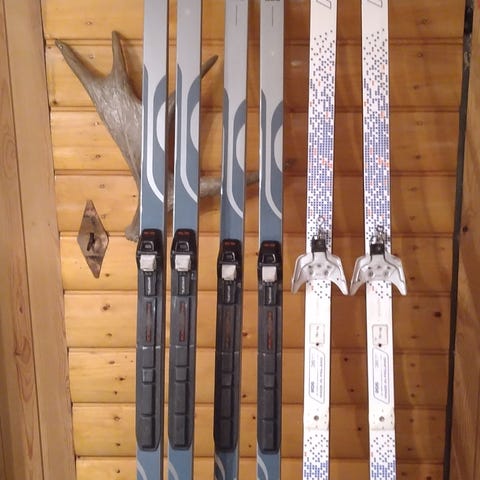 Karhu Touring suksissa (130 cm) on helppokäyttöiset Salomon Snowmonster classic Jr siteet perinteisen tyylin hiihtoon. Apollo Rex suksisauvat ovat 100 cm pitkät. Lapselle käytettyinä ostetut välineet ovat vielä suht ehjät ja siistit (suksisauvojen remmit ovat haalistuneet).
