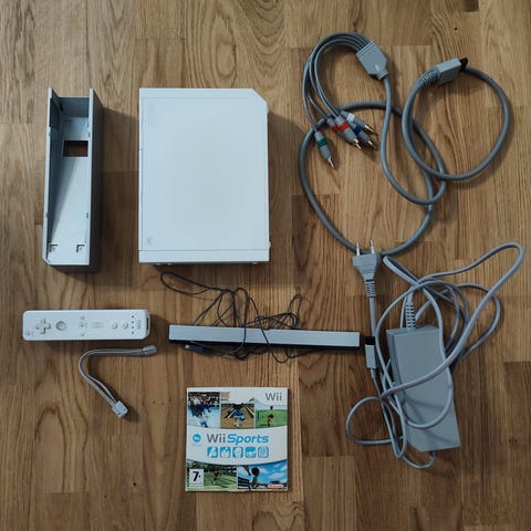 Nintendo Wii paketti. Mukaan kuvan tarvikkeet. Mukaan mm. Konsoli johtoineen, jalusta, ohjain ja nunchuck.