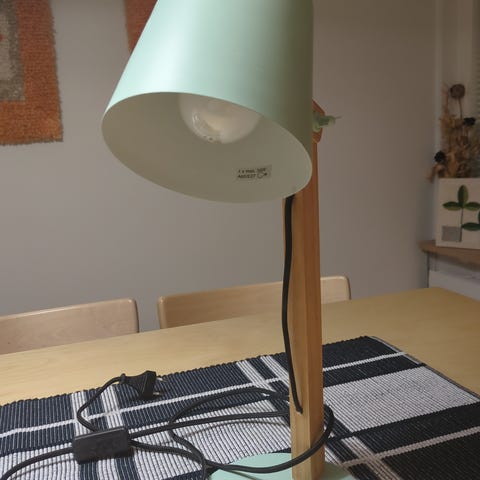 Musta varjostin ja hopeanvärinen lampunjalka. Ollut käytössä joten pientä käytönjälkeä mutta ehjä ja perus siisti. Hehkulamppu ei kuulu kauppaan. Korkeus 50 cm. Nouto Loviisasta, Sipoon Nikkilästä tai Helsingin Suutarilasta.