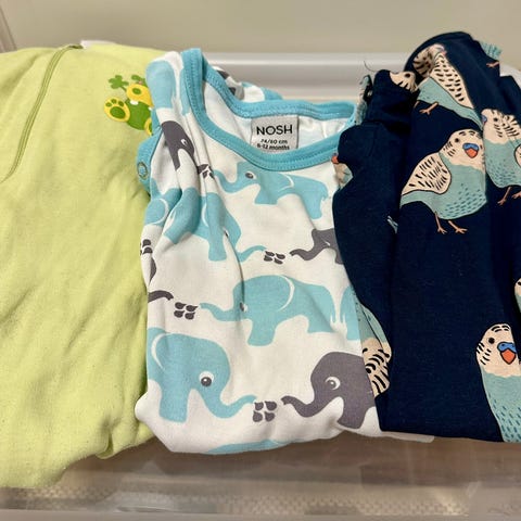 Paljon käytetyt mutta ehjät yöpuvut koko 80. Osassa kokomerkintä 74-80 mutta samaan aikaan ollut käytössä. 5kpl joista vaaleimmissa värjäymiä niistä kuvat ja valkoinen pupu yökkäri kaupan päälle, siinäkin värjäymiä joita en saanut lähtemään