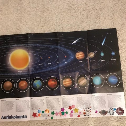 Myydään leikki aurinkokunta jossa lapsi voi liikutella planeettoja. Ostettu Flying Tiger kaupasta.