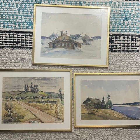 Arvo Rissasen akvarellityö Laiva saapuu satamaan vuodelta 1957. Työn korkeus on 26 cm ja leveys 34 cm. Kehys 43 X 51 cm.