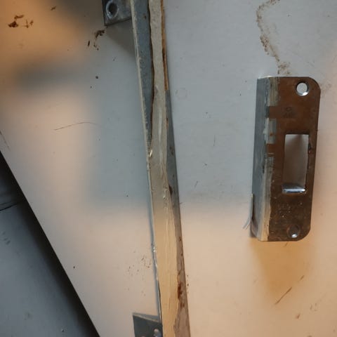 Oven, tms. murtosuojarauta. Raudan pituus n. 35 cm, leveys 2 cm. Kiinnityslaipat 38 x 28 mm.