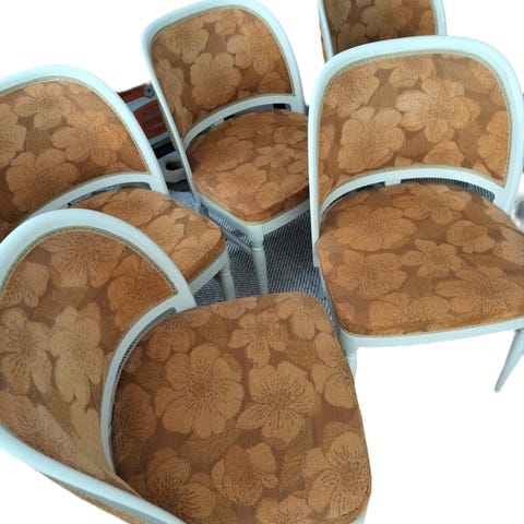 Koristeelliset tammipuuta olevat ruokapöydän tuolit. Rakenteeltaan ehjät ja kunnossa.