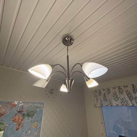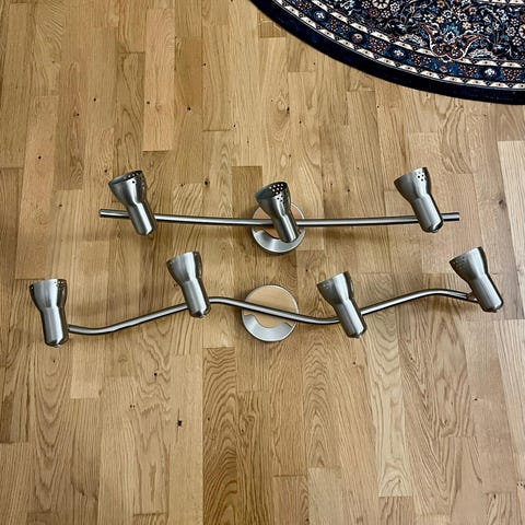 2 kappaletta kattovalaisimia 2xE14 kannalla. Halkaisija noin 30cm, korkeus noin 20cm.