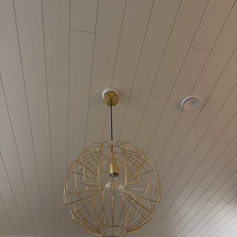Kaunis keltainen & messinkinen kattovalaisin! Varjostimet ja valaisin ovat hyvässä kunnossa. Kytkentä sähköpistotulpalla.