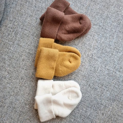 6 paria sukkia vastasyntyneelle. Paksumpia kuin tavalliset sukat. Osassa pesunukkaa.