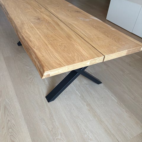 Myydään teetetty uniikki lankkupöytä puujaloilla.