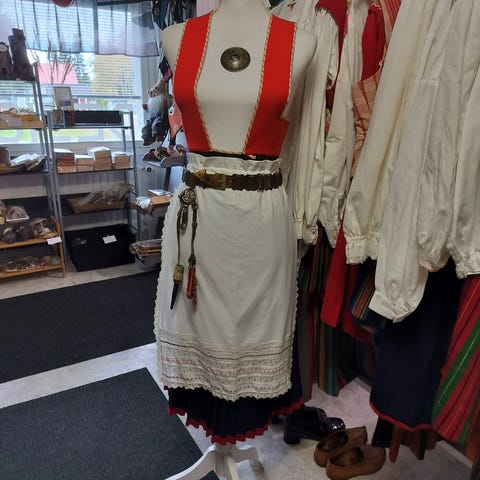 Oulun seudun kansallispuku, koko n. 38. Itse kudottu kangas, käsin ommeltu kaikki puvun osat. Tehty 80-luvun alussa. Suutarin tekemät nahanväriset kengät ( koko 37'38) ja kyläsepän tekemä avain. Ei myssyä, päänauhat on. Vähän käytetty, erittäin siisti.