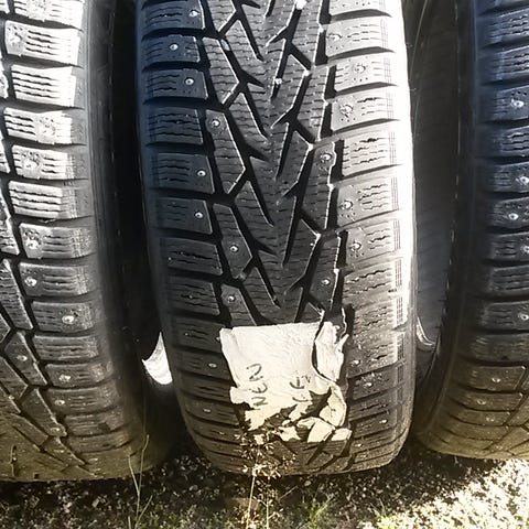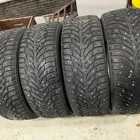 Nokian Hakkapeliitta 8 nastarenkaat hyvät joissa pintaa 8mm koko 215/60 17" kaikki nastat paikoillaan ja kiinni tasaiseen kuluneet