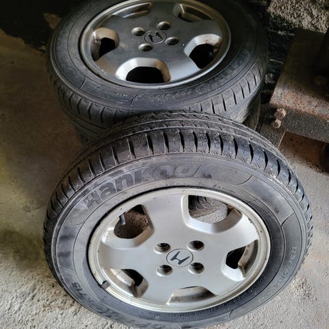 Hyväkuntoiset, kuvassa likaiset, peltivanteet todennäköisesti Hondasta. Offset eli ET on 45mm, pulttijako 5x114,3 ja keskireikä 64mm.