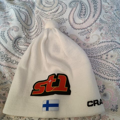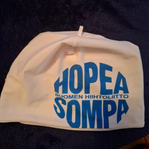 Kauniin keskisininen, valkoinen pieni tupsu, Suomi-logo turkoosi/valkoinen