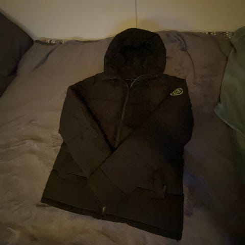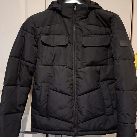 Myydään hyväkuntoinen Boohoo miesten musta talvitakki hupulla.