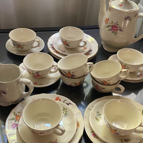 Myydään joskus käytössä olleita Arabian ilmeisesti "Kesäkukka" sarjan astioita 5 kpl. Sisältäen soppaskooli 2kpl, tarjoiluvadit 2 kpl sekä kulhon.