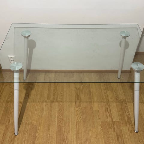 Annetaan painava lasipöytä, pöydässä puukuvioinen dc-fixi, joka repeillyt jo.