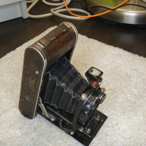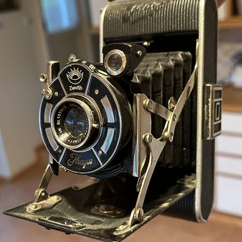 Optiikka E. Ludwig Meritar 105 mm f 4.5, mukana 6 x 4.5 maski.