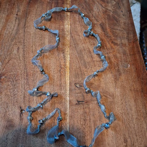 Sifonkinauha ja lasihelmet. Kokonaispituus n. 146cm.