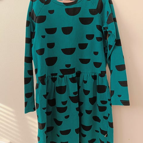 Keltainen Paapii sydäntasku mekko. Koko 128 cm, mutta jokseenkin reiluhko.