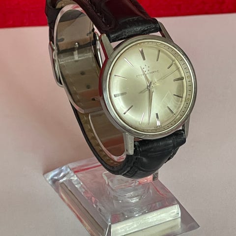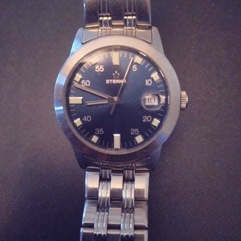 Eterna "pukukello". Siisti kuntoinen. Halkaisija nupin kanssa 30mm. Hirsch ranneke. Uudehko patteri.