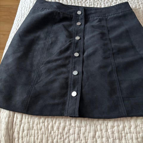Klassinen ja ajaton vuorillinen musta hame. Säilytyksestä ryppyyntynyt, ei muuta moitittavaa. Päälliskankaassa kiva tekstuurinen pitsikuvio. Väri haalistumaton musta. Osa kuvista tarkoituksella ylivalotettuja, että yksityiskohdat näkee paremmin!