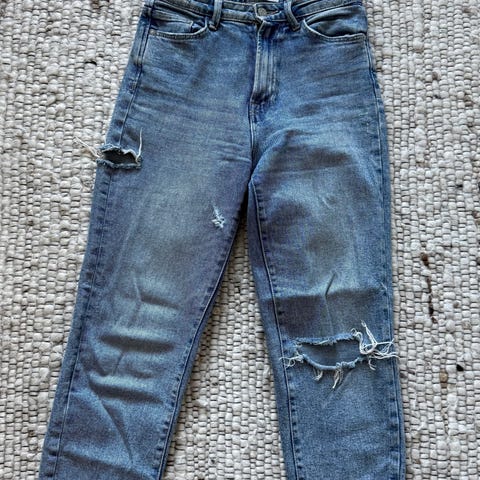 Vaalean siniset strech farkut hienoilla kulutuksilla. Joustaa reilusti. Regular high waist. Koko EU 36. Merkki Stradivarius. Materiaali 89% puuvilla, 9% polyesteri, 2% elastaani. Uusi, käyttämätön.