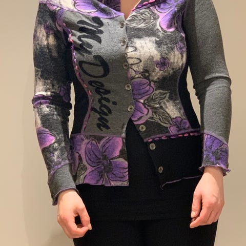 Kokomerkintä 36/38, mutta on reilua mitoitusta ja mahtuu itsellenikin/koko L, 173 cm. Materiaali pehmeää, sileää ja hieman kiiltävää akryylia, joka ei kutita. Erittäin kauniit lilan sävyt.