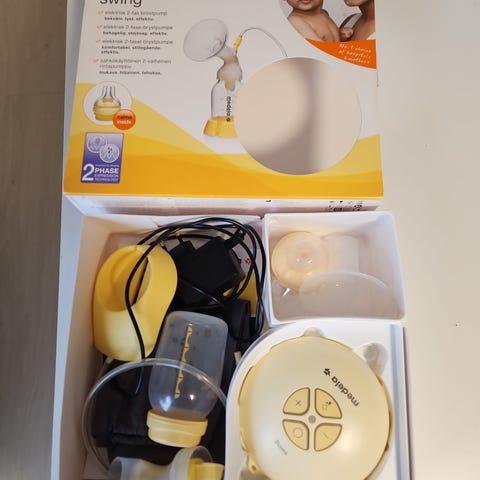 Myydään Medelan rintapumppu kuvan tarvikkeiden kanssa (sis. valkoisen liivin).