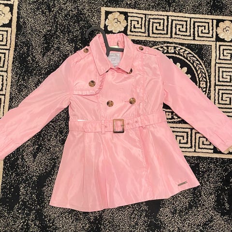 Valkoinen Moncler lasten vanhempaa mallia oleva trenssi/tuulitakki. Pesulappu haalistunut ja koko noin. 104cm.