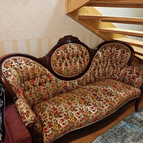Myydään tilanpuutteen vuoksi hyvin palvellut penkkisohva. Sohva on ollut lämpimissä sisätiloissa. Puuosat tummaa tammea, istuin- ja selkäosassa gobeliiniverhoilu.
