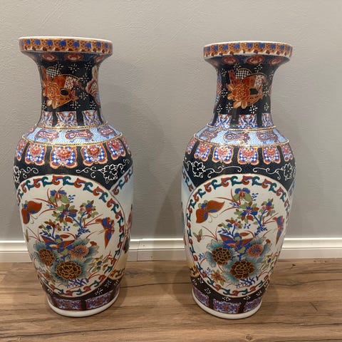2 antiikkikiinalaista maljakkoa, ostettu Kiinasta 1970-luvun lopulla, 1980-luvun alussa. Molemmissa leimat pohjassa. Ei leikkauksia. Mieluummin myyn ne yhdessä, mutta jos haluat ostaa vain yhden, niin sovitaan hinta. Isompi on 38cm korkea. Pieni on 21 cm pitkä.