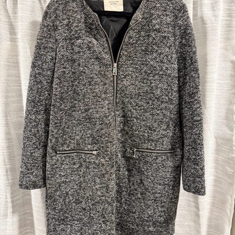 Siisti harmaansininen villakangastakki. Edessä vetoketju ja taskut.
