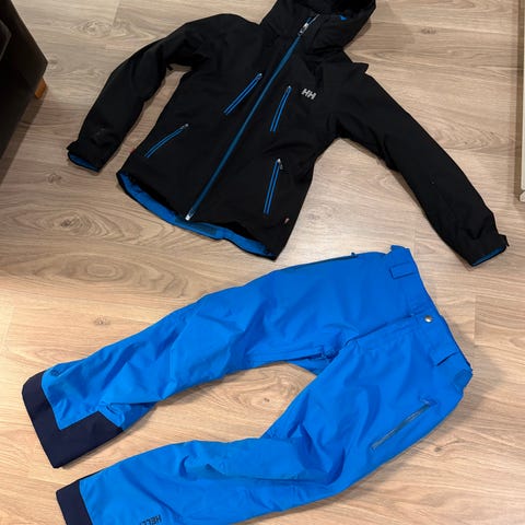 Helly Hansenin laskettelutakki ja housut, miesten S koko. Kunto hyvä, mutta toisessa housulahkeessa pientä kulumaa ja pieni korjauspaikka. Takissa lumilukot, tasku hissilipulle ym.