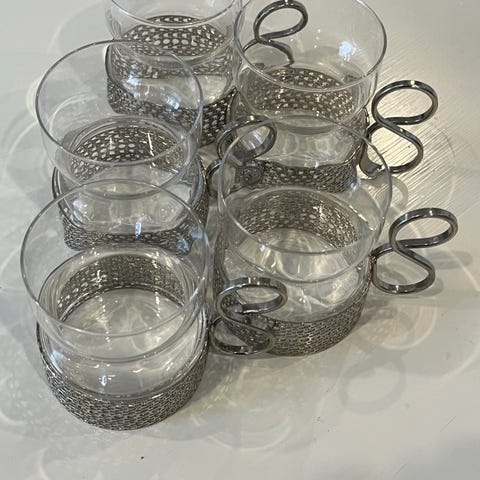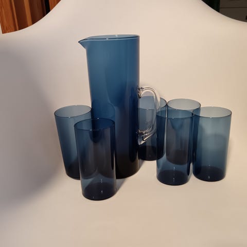 Iittala Timo Sarpaneva mehukaadin ja 6 lasia. Iittala-Karhula. Hyväkuntoiset. Ei säröjä. Tarrat osittain kuluneet. Alkuperäinen pakkaus, pakkauksen muovikansi osittain haljennut.