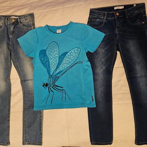 Käsityönä itse ommeltuja vaatteita sekä merkkeinä mm. Levi's.