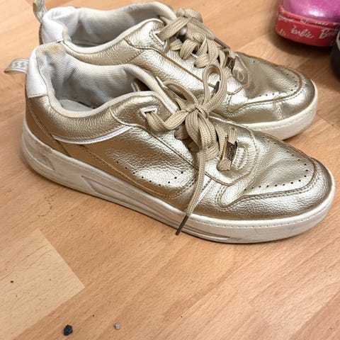 Myydään kultaiset tennarit, koko 38,kärjessä hieman kulumaan muutoin siistit ja hyvät jalkaan. Mahdolliset postit lisätään lisätään hintaan.