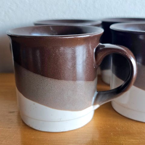 17kpl, 1970-l mukit keraamiset kivitavaraa, Kermasaven tyyliset 3-väri raidalliset, käyttämättömät, hyvin kestävät: tiskikone, micro. 8,5x8,5cm.