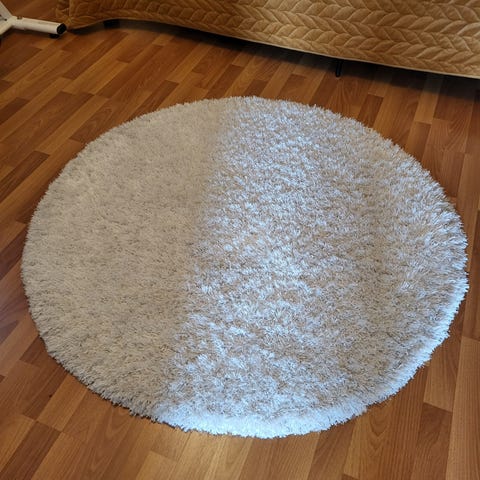 VM-Carpetin hyväryhtinen 160 cm halkaisijaltaan oleva nukkamatto. Väri vaaleanharmaa. Pehmeä jalan alla ja pysyy hyvin paikallaan pohjan nihkeyden vuoksi. Ei jätä lattiaan jälkiä. Kestää kovaakin kulutusta ja tahrat saa helposti pyyhkimällä pois. Kuvassa matto hieman muhkurainen, kun on ollut paketissa mutta oikenee kyllä kun lattialle asettaa. Matto pesetetty säännöllisesti pesulassa. Nyt täysin puhdas. Lemmikkitalous.